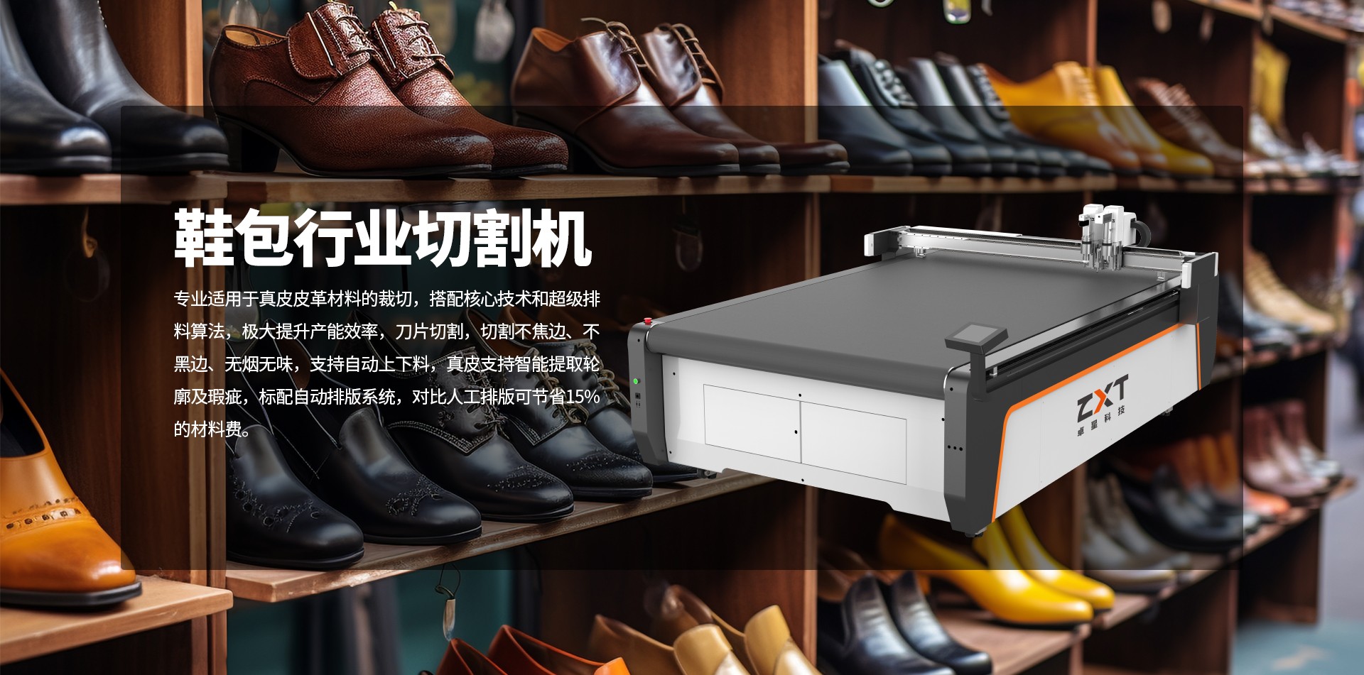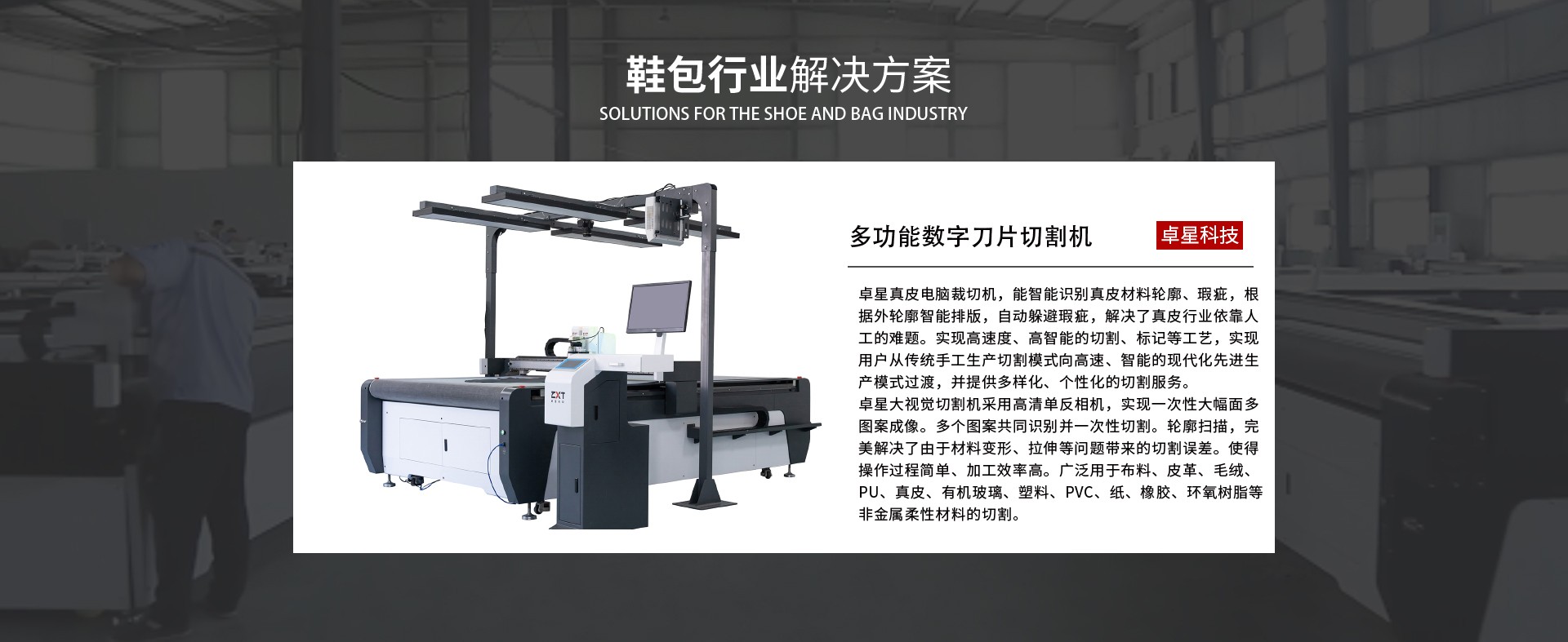 卓星真皮電腦裁切機,能智能識別真皮材料輪廓、瑕疵,根據(jù)外輪廓智能排版,自動躲避瑕疵,解決了真皮行業(yè)依靠人工的難題。實現(xiàn)高速度、高智能的切割、標記等工藝,實現(xiàn)用戶從傳統(tǒng)手工生產(chǎn)切割模式向高速、智能的現(xiàn)代化先進生產(chǎn)模式過渡,并提供多樣化、個性化的切割服務。