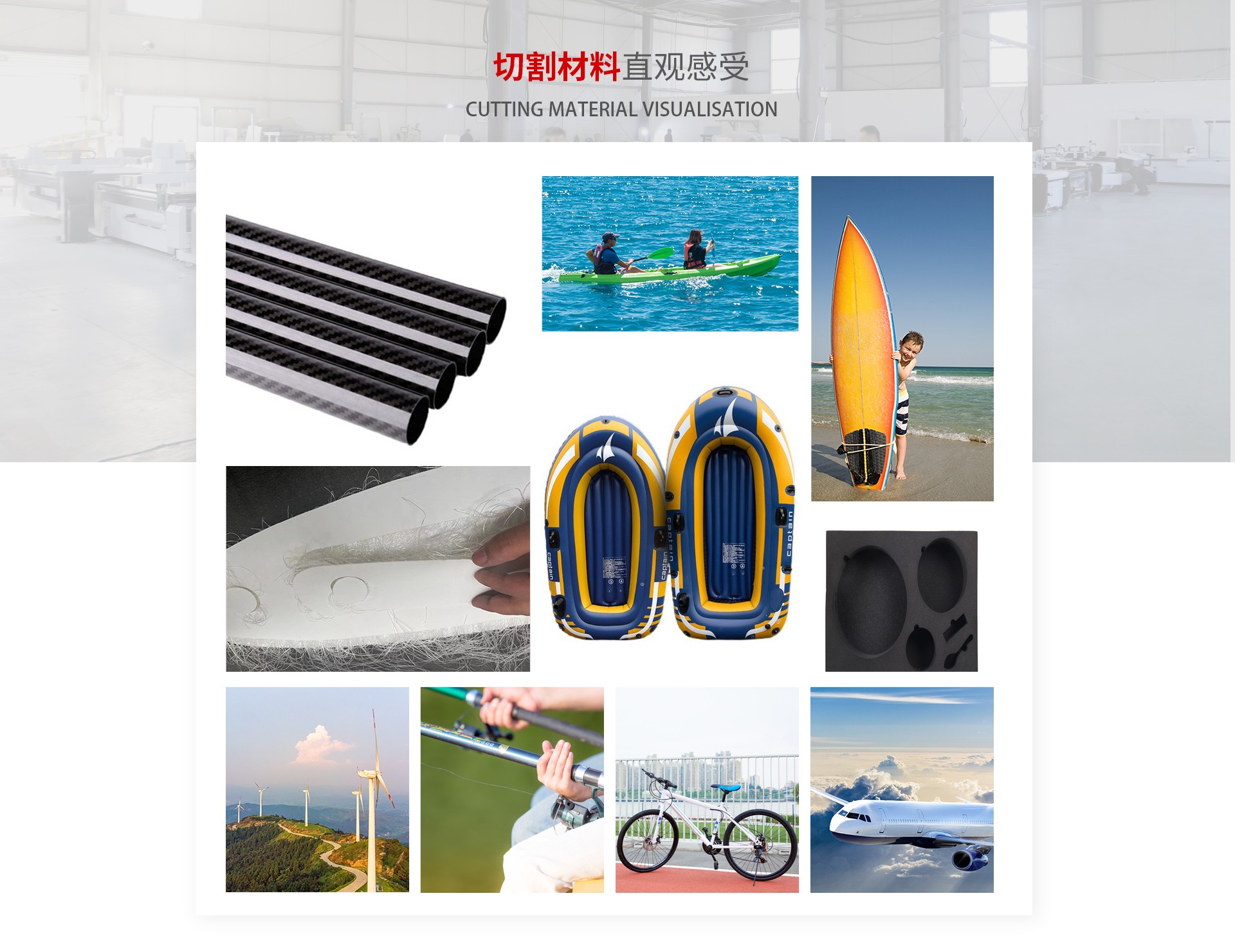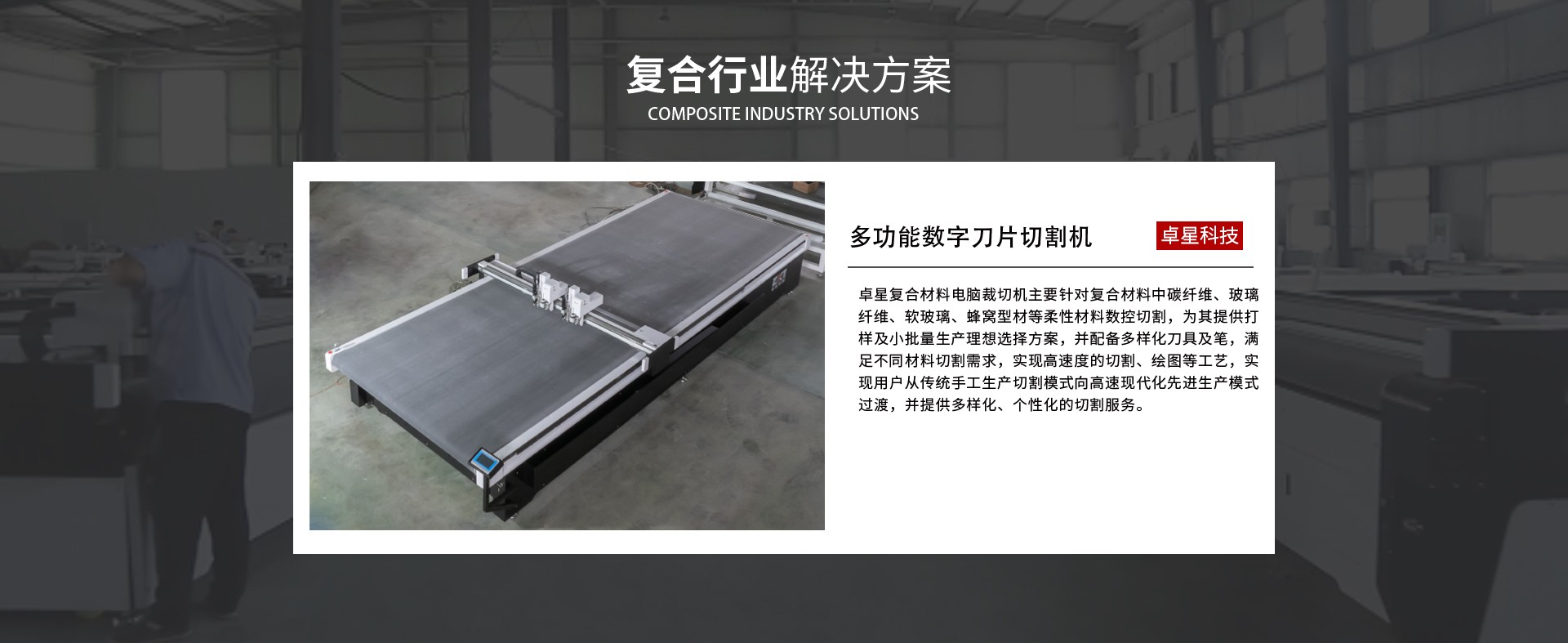 卓星復合材料電腦裁切機主要針對復合材料中碳纖維、玻璃纖維、軟玻璃、EVA海綿、蜂窩型材等柔性材料數控切割,為其提供打樣及小批量生產理想選擇方案,并配備多樣化刀具及筆,滿足不同材料切割需求,實現高速度的切割、繪圖等工藝,實現用戶從傳統手工生產切割模式向高速現代化先進生產模式過渡,并提供多樣化、個性化的切割服務。